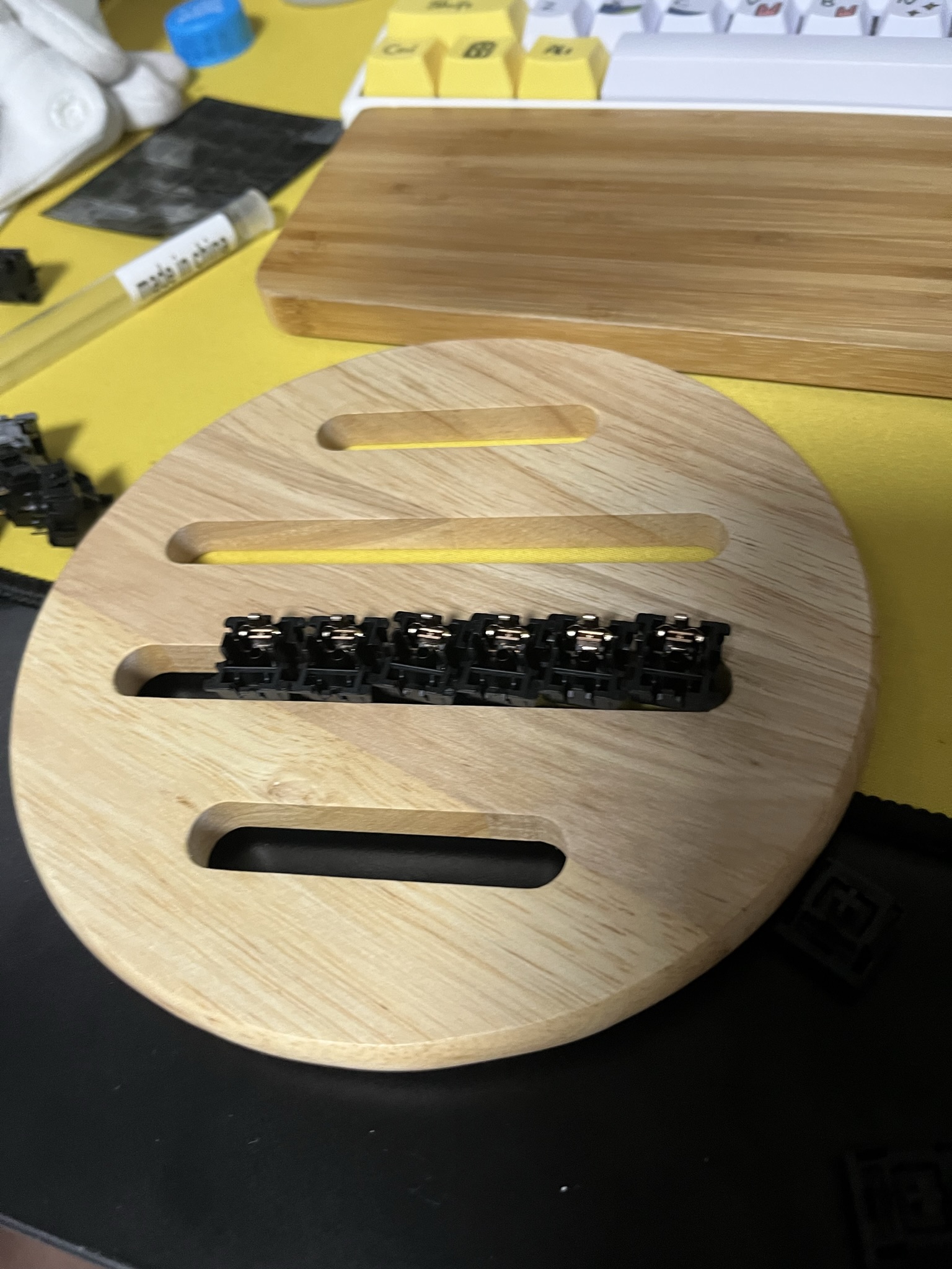 프레임 스탠드에 스위치 오프너를 배치하고 오프너에 체리 블랙 액슬을 배치했습니다.