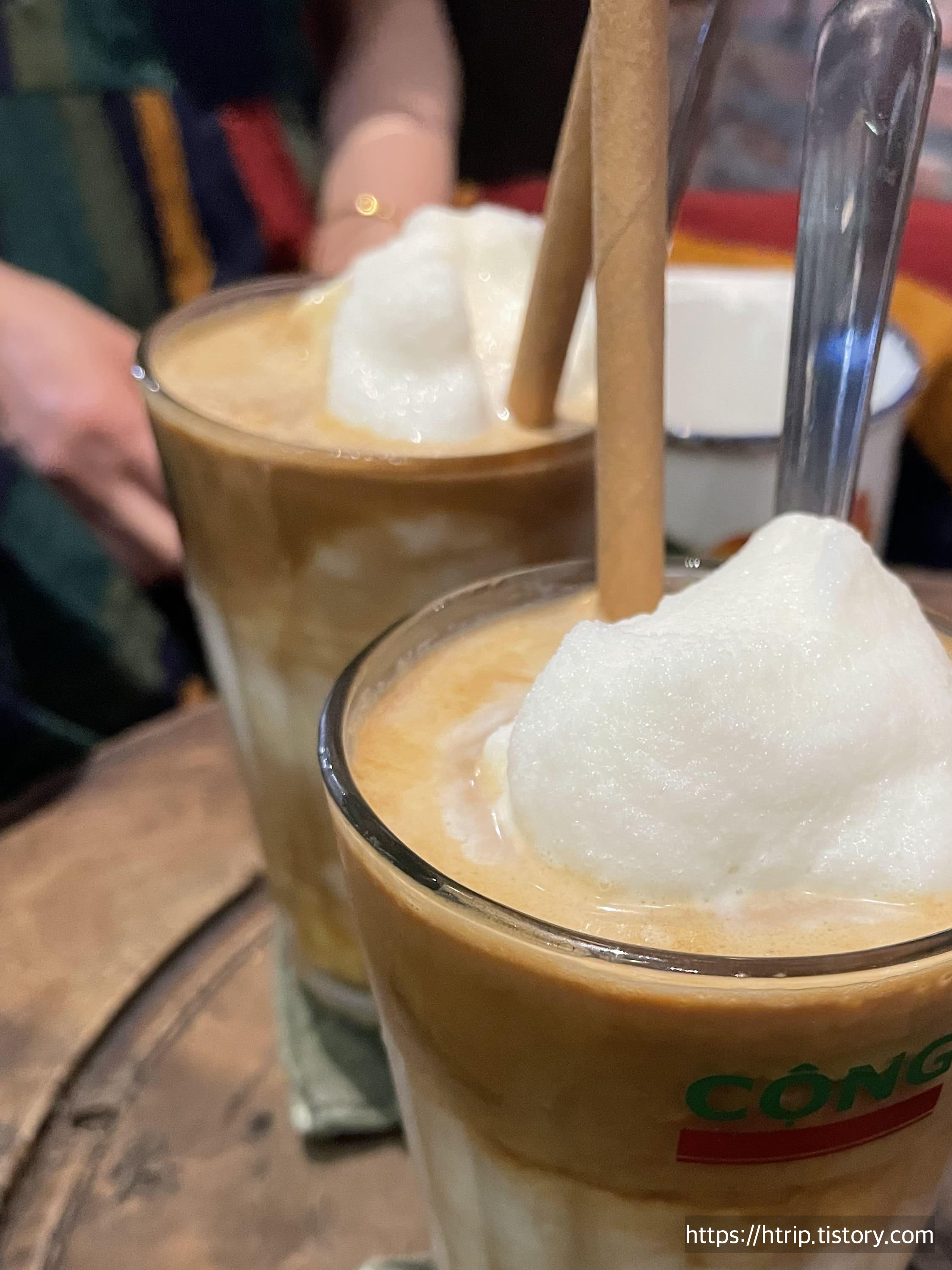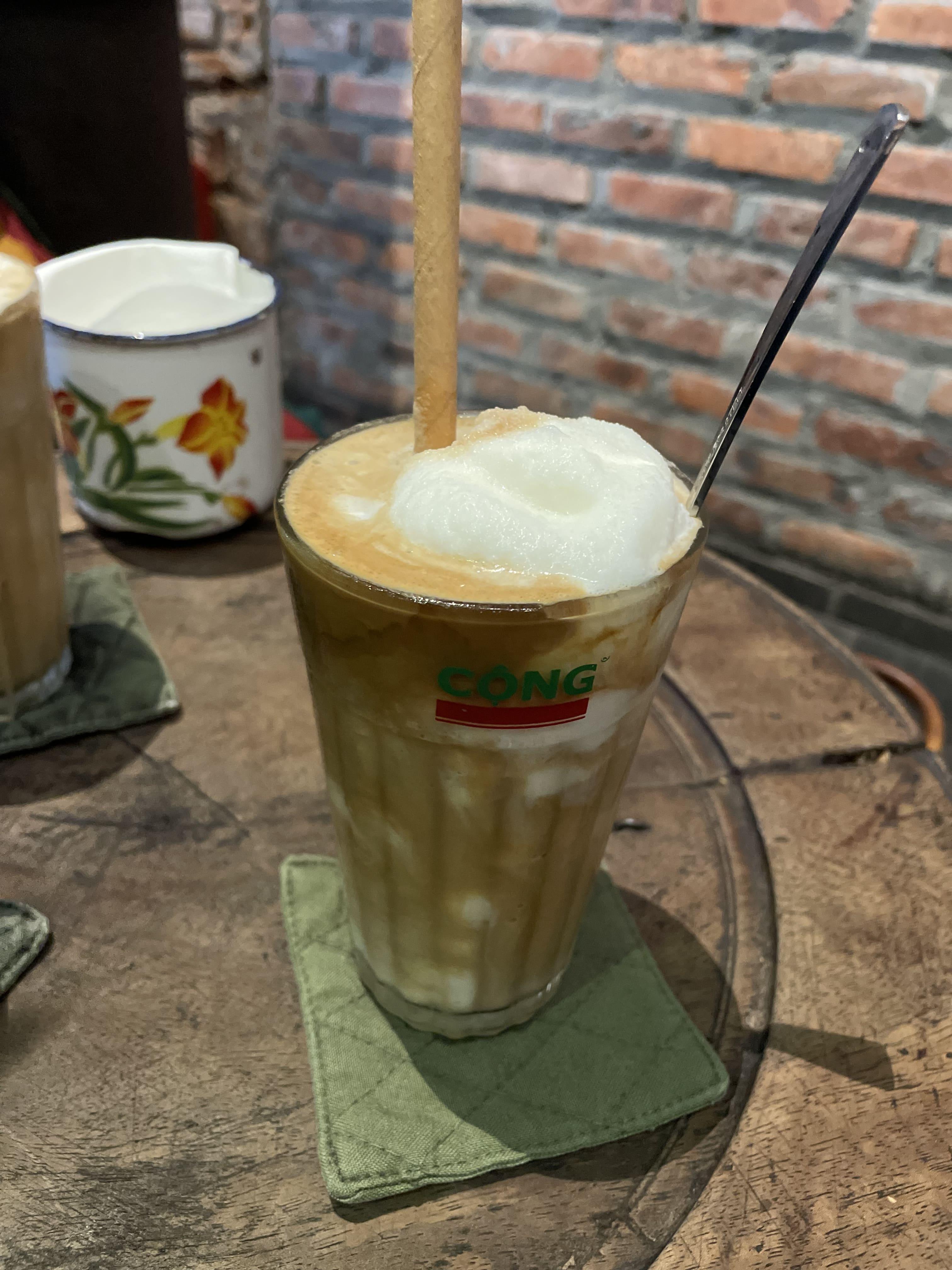 주문하고 얼마 지나지 않아 콩카페 대표 메뉴가 “코코넛 밀크 커피”나타났다. 후덥지근한 날씨에 시장에 나가기 전 커피 한 잔 하며 체력 보충하기에 최적의 장소인 것 같다. 나는 한국에서 CONG을 보았지만 베트남에서는 달랐다.