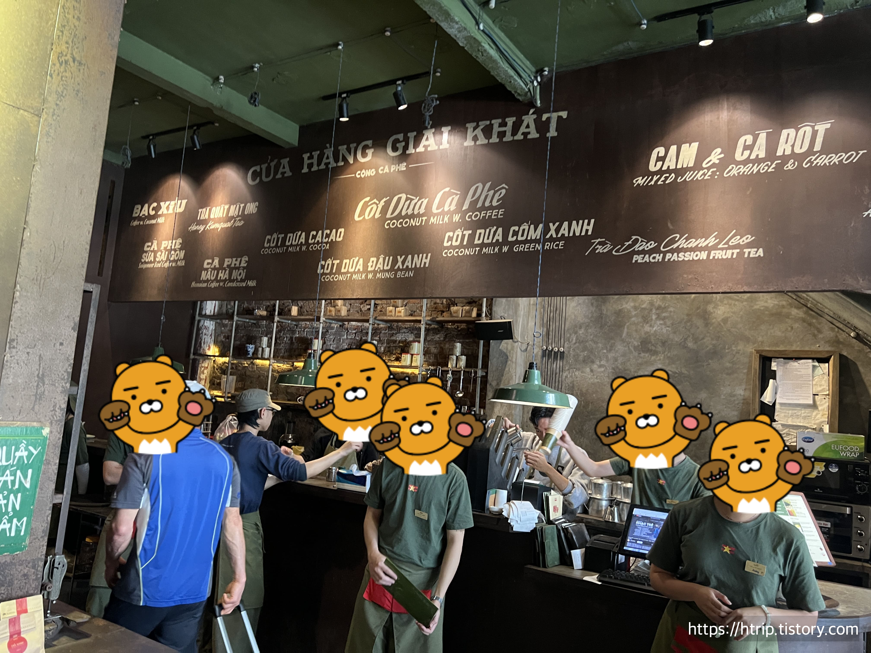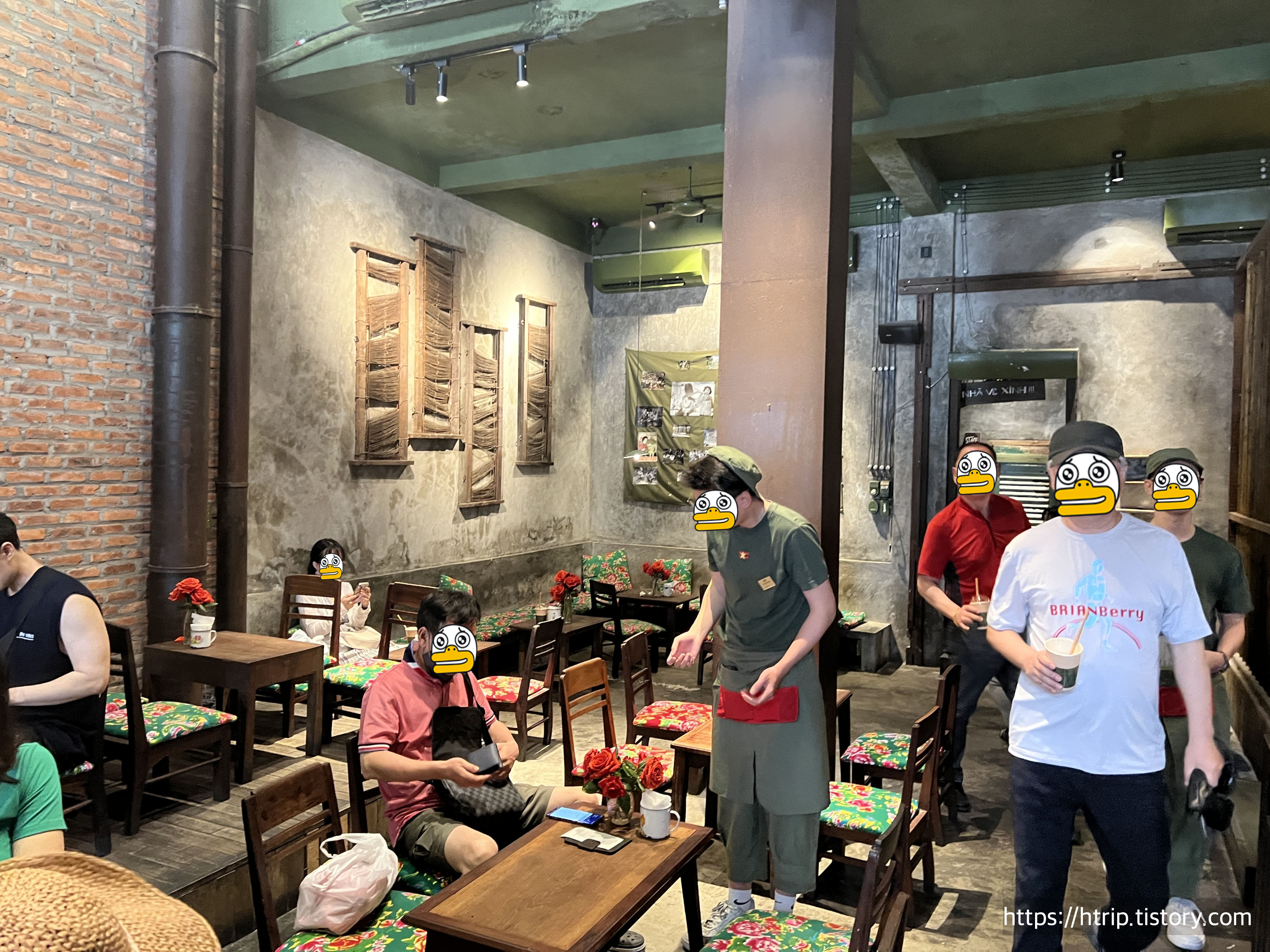 콘카페 2번이 1번보다 더 좋은 평가를 받았습니다. 제가 갔을 때도 사람이 꽤 많았는데 대기할 정도는 아니었어요. 베트남어와 군복으로 차려입은 스태프들의 모습을 보니 콘카페의 분위기에 더욱 취하게 된다.