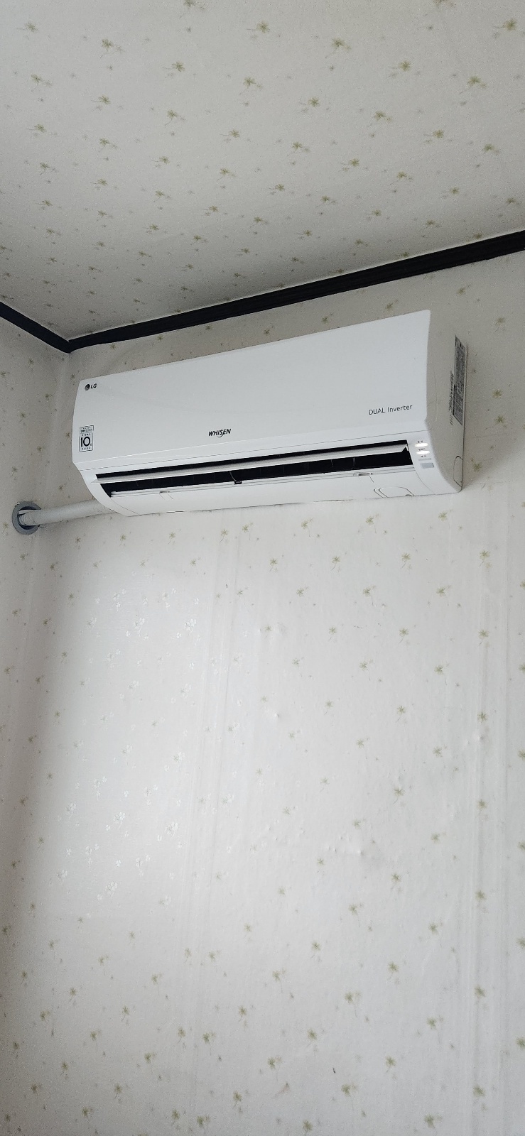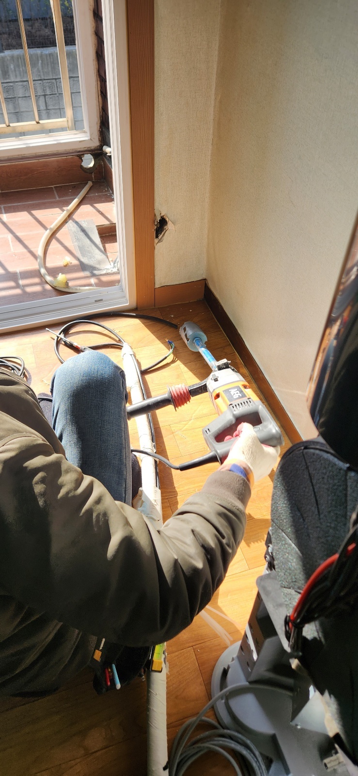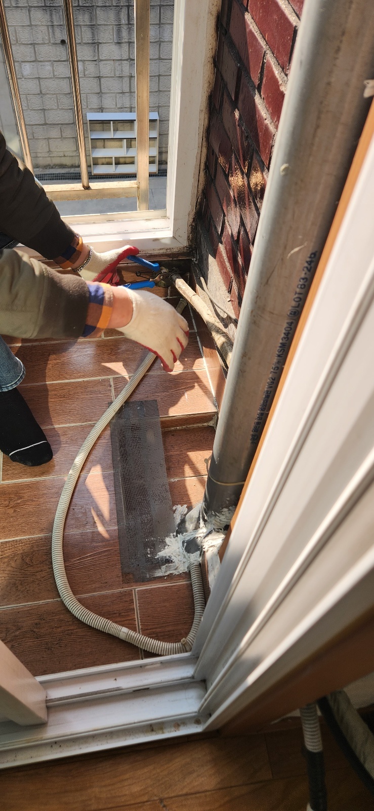 박 과장은 벽걸이 배관을 상단 벽을 통해 배선합니다.