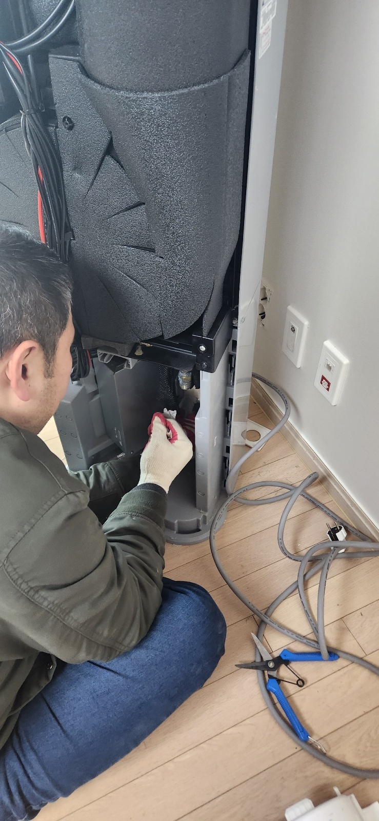 우리는 실외기를 들어 진공 청소기로 청소합니다.