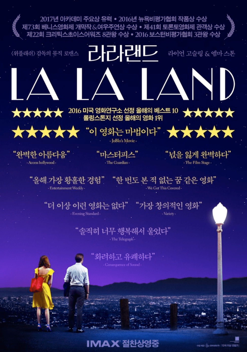 는 2016년 개봉한 뮤지컬 로맨스 영화로 배우 지망생 미아와 재즈 피아니스트 세바스찬이 LA에서 만나 사랑에 빠지는 이야기를 그린다. 이 영화는 경쟁이 치열한 LA 연예계에서 두 연인의 관계와 꿈을 이루기 위한 싸움을 조명한다. 영화는 미아와 세바스찬이 처음 만나는 LA 교통 체증을 배경으로 한 음악으로 시작됩니다. 그들은 처음에는 호감이 가지 않고 서로를 싫어하지만 곧 서로의 열정과 야망에 이끌리게 됩니다. 그들은 회오리 바람 로맨스를 시작하고 꿈을 이루기 위해 서로를 지원합니다. Mia는 많은 오디션을 보았지만 매번 떨어졌습니다. 결국 미아는 1인극을 쓰고 공연하지만 그녀의 평가는 엇갈린다. Sebastian은 인기 있는 재즈 밴드에 합류할 기회를 얻었지만 그의 예술적 비전이 타협되고 있다는 사실에 갈등을 겪습니다. 그들의 경력이 시작되면서 Mia와 Sebastian의 관계는 소원해집니다. 그들은 꿈이 그들을 다른 방향으로 데려가는 동안 표류하는 자신을 발견합니다. 고통스러운 이별 후 미아는 LA를 떠나 집으로 돌아가기로 결심한다. 몇 년 후, Mia는 성공적인 배우이자 어머니가 됩니다. 그녀는 남편과 우연히 만난 재즈 바에서 전 애인 세바스찬을 만난다. 미아는 그들이 헤어지지 않고 서로를 계속 사랑했다면 어땠을지 상상한다. 결국 달달하면서도 씁쓸한 미소를 지으며 각자의 길을 가게 된다. 영화 생생한 색감과 현란한 음악, 놀라운 연출이 돋보이는 할리우드 황금기에 보내는 러브레터다. 이 영화는 비평가들의 찬사를 받았으며 전 세계적으로 4억 달러 이상의 수익을 올리는 흥행 성공을 거두었습니다.