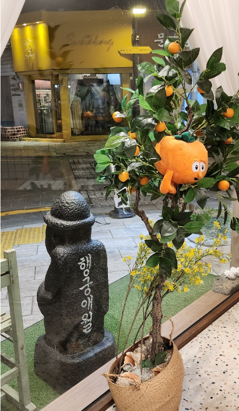 밖으로 나오니 하루방 뒤에 행궁 애월이라는 이름이 적혀 있었는데 밖에서는 몰랐다.