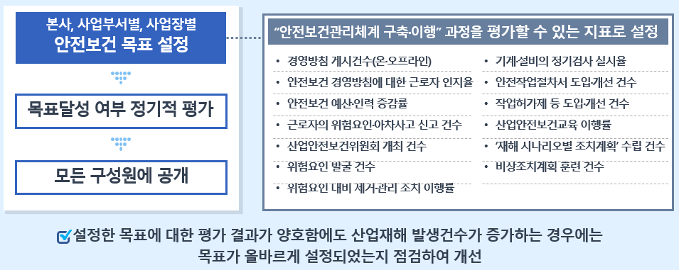 1.안전보건관리체계 구축 및 그 이행에 관한 조치 □안전보건관리체계 구축 및 이행 ■안전보건관리체계 구축과 이행이란 근로자를 비롯한 모든 일하는 사람의 안전과 건강을 보호하기 위하여 기업 스스로 유해하거나 위험한 요인을 파악하여 제거·대체 및 통제방안을 마련·이행하고 이를 지속적으로 개선하는 일련의 활동을 의미한다.