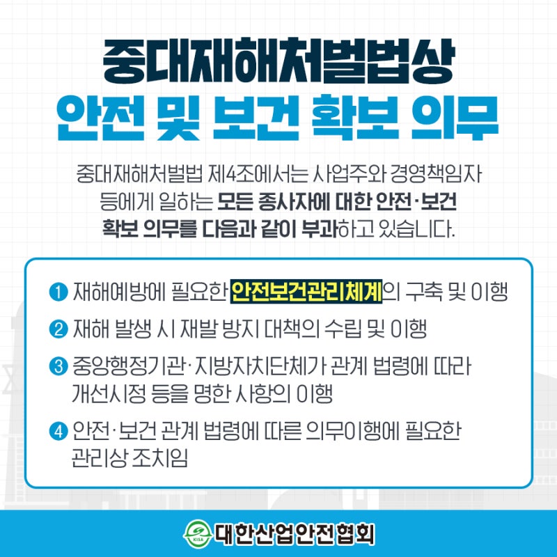 중대재해처벌법 제4조에서는 사업주와 경영책임자 등의 안전 및 보건확보의무를 정하면서 종사자의 안전·보건상 유해 또는 위험을 방지하기 위하여 조치를 취하도록 정하고 있습니다.중대재해처벌등에관한법률