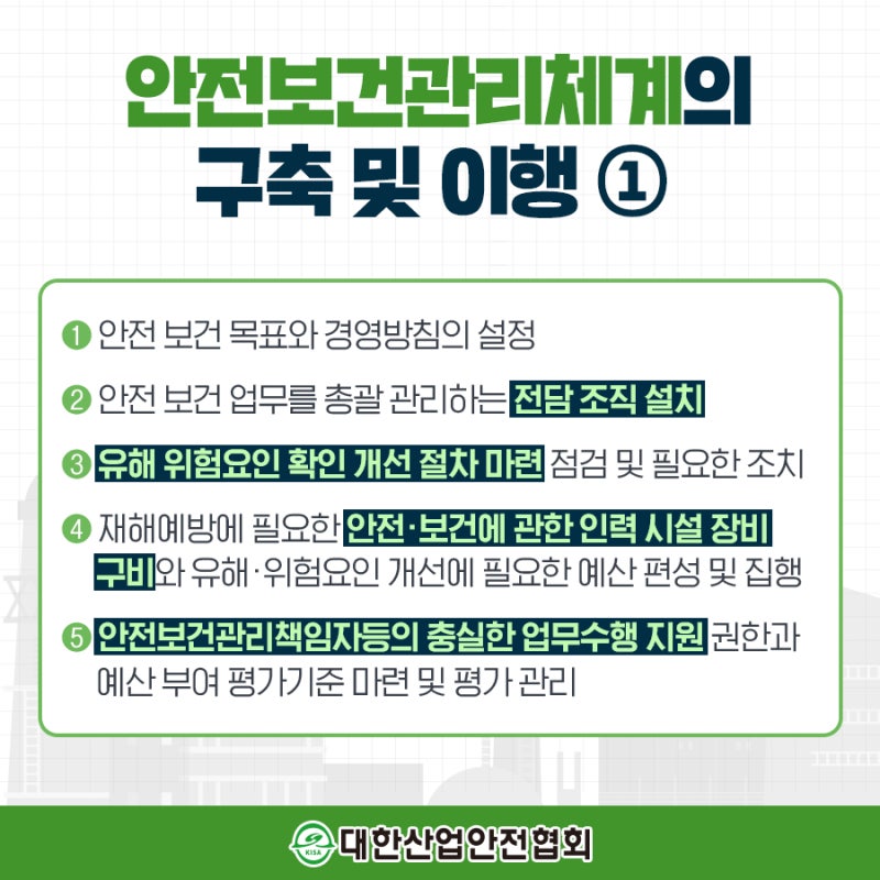 1.안전보건관리체계 구축 및 그 이행에 관한 조치 □안전보건관리체계 구축 및 이행 ■안전보건관리체계 구축과 이행이란 근로자를 비롯한 모든 일하는 사람의 안전과 건강을 보호하기 위하여 기업 스스로 유해하거나 위험한 요인을 파악하여 제거·대체 및 통제방안을 마련·이행하고 이를 지속적으로 개선하는 일련의 활동을 의미한다.