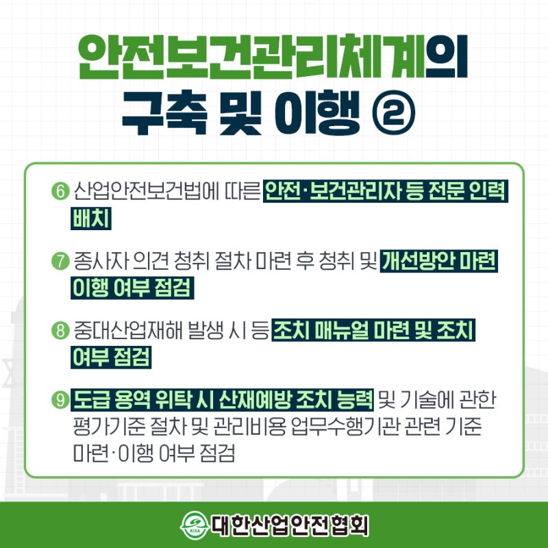 □ 안전 보건 관리 체계 구축에 관한 9개의 의무 사항의 이행은 면밀히 파악된 유해·위험 요인을 중심으로 유기적으로 연계해야 한다.■ 모든 기업, 기관은 사업 또는 사업장 규모, 특성 등에 따른 각기 다른 유해·위험 요인을 갖고 있으며 인력 및 재정 사정 등도 다르기 때문에 유해·위험 요인을 통제하는 구체적 수단, 방법을 일률적으로 정하기 어렵고, 기업 조건에 맞게 자율적 판단이 이루어져야 한다.키워드:중대 재해 처벌 법 안전 및 보건 확보 의무, 안전 보건 관리 체계 안전 보건 관리 체계 구축 및 이행, 중대 재해 처벌 법 경영자 의무, 안전 확보 의무, 보건 확보 의무 중대 재해 처벌 법 적용 범위, 중대 재해 처벌 법 보호 대상, 중대 재해 처벌 법 종사자 안전 보건상 유해 또는 위험 방지, 중대 재해 처벌 법 안전 보건 관리 체계 구축 중 중대 재해 컨설팅#중대 재해 처벌 법 자문#산업 안전 보건 공단 자문 변호사#중대 재해#중대 재해 적용 대상자#중대 재해 정의#중대 재해의 범위에 해당하는지#중대 재해 정의#중대 재해의 하나는 중대 재해의 범위에 해당하는가. 중대 재해의 재해 처벌 법 준비 중 중대 재해 대응#중대 재해 처벌 법, 기업 대응#건설업 중대 재해 처벌 법#중대 재해 상시 근로자 수 계산. 중대 산업 재해 행정 처분#중대 산업 재해 조사 대응#고용 노동부 특별 감독. 중대 재해 처벌 법 노동자#다중대 재해 근로자#중대 재해 적용 대상 근로자#공무원 중대 재해#안전 보건 확보 의무#중대 재난 안전 의무는 중대 재해 보건 확보 의무#안전 보건 관리 체계 구축