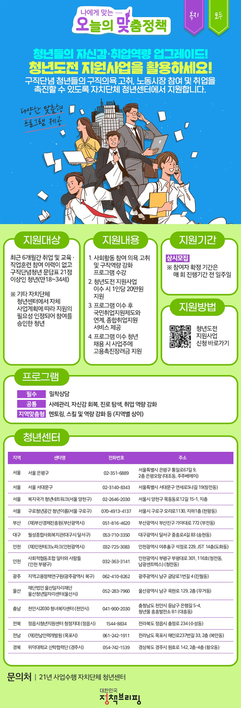 청년챌린지 지원사업이란? 청년챌린지 지원사업은 지자체 및 기타 운영기관과 협력하여 취업을 포기한 청년을 발굴·채용하여 노동시장 참여 및 취업을 촉진하고, 사회활동 참여를 장려하기 위한 맞춤형 프로그램을 제공하며, 취업 기회를 제공하는 사업이다. 학업을 마친 사람들에게 지원을 제공합니다. 시스템을 통해 취업을 지원하는 사업으로, 채용 시 고용촉진 인센티브와 연계된다. 청년챌린지 지원사업의 대상은 누구인가요? 본 사업의 지원 대상은 취업을 희망하는 모든 청년이 아닌, 취업을 포기하고 6개월 이상 취업, 교육, 직업훈련에 참여하지 않은 청년, 취업을 준비하는 청년 등이다. 자립, 청소년복지시설 입·퇴원, 북한을 떠나는 청년들. 취업을 포기한 청년의 경우 6개월 이상 취업 이력이 없거나 교육·직업훈련에 참여한 이력이 없어야 한다. (고졸(또는 예정자 제외)) 아래 취업 포기 청년들을 대상으로 한 설문에서는 취업 의지(3점)와 취업 태도(3점), 취업 태도 스트레스(3점), 직업 경력(5점), 구직 활동(6점), 신중함 점수(10점)입니다. 총 30점 만점에 21점 이상을 획득한 청소년(18~34세)이 대상이다. 구직을 포기한 청년을 위한 질의응답지