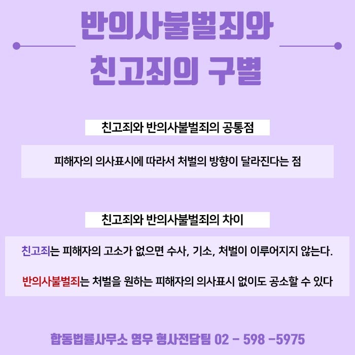 피해자의 고소가 없어도 수사기관이 기소해 처벌할 수 있는 죄인데 피해자가 처벌을 원하지 않는다는 의사표시를 할 경우 처벌할 수 없는 것을 말한다. *다만 해당 의사표시를 1심 판결 선고 이전까지 해야 성립된다. 쉽게 말해 고소, 고발 이후 1심 판결 이전까지 피해자가 가해자 처벌을 원하지 않는다면 가해자 처벌이 이뤄지지 않는 제도입니다. 친고죄모욕죄,비밀침해죄,사자명예훼손죄,업무상비밀누설죄,반의사불벌죄폭행죄,협박죄,명예훼손죄,과실치상죄