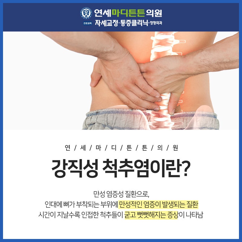 안녕하세요. 향남코리아정형외과 입니다. 추석 연휴가 얼마 남지 않았지만 또 한 번의 명절이 찾아왔습니다. 요 며칠 가을공기가 높고 선선하니 조금 쌀쌀하긴 하지만 외출하기 좋은 날씨인 것 같습니다. 예전 같으면 이맘때면 많은 사람들이 단풍을 보러 갔을 텐데. 다만, 코로나가 여전한 만큼 사람이 많이 모이는 곳을 피하고, 외출 시 마스크를 착용하고, 밖에서 손을 자주 씻는 등 건강을 유지하도록 힘쓰시기 바랍니다. 사회적 거리두기를 지키면서 즐거운 명절 보내시길 바랍니다. 오늘은 허리가 뻣뻣하고 엉덩이나 허벅지 뒤쪽에 통증이 있는 것이 특징인 강직성 척추염에 대해 말씀드리려고 합니다.