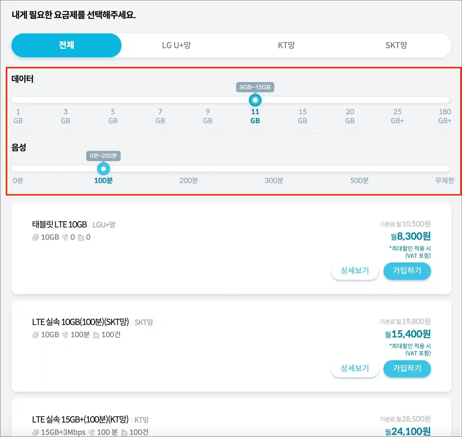 요금제 추천 사이트입니다. 데이터 11GB, 음성 100분이면 충분하니 합리적인 요금제를 추천합니다. SKT 망이지만 데이터 10GB, 통화 100분에 LTE 요금제가 딱 적당하다. 요금은 월 19,800원이지만 최대 할인을 적용하면 15,400원으로 떨어집니다. 기존 통신사 요금제에 비해 매우 편리합니다.